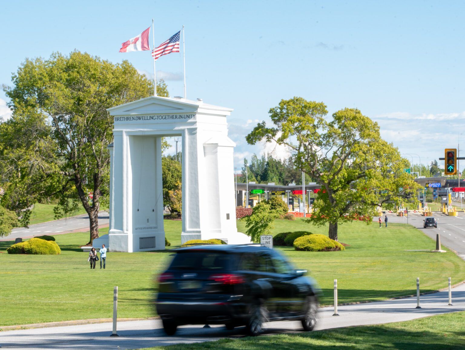 Traffic heading into the U.S. at the Peace Arch border crossing in May 2024. Border tensions are expected to affect cross-border visits during the 2026 World Cup games. (Finn Wendt/Cascadia Daily News)